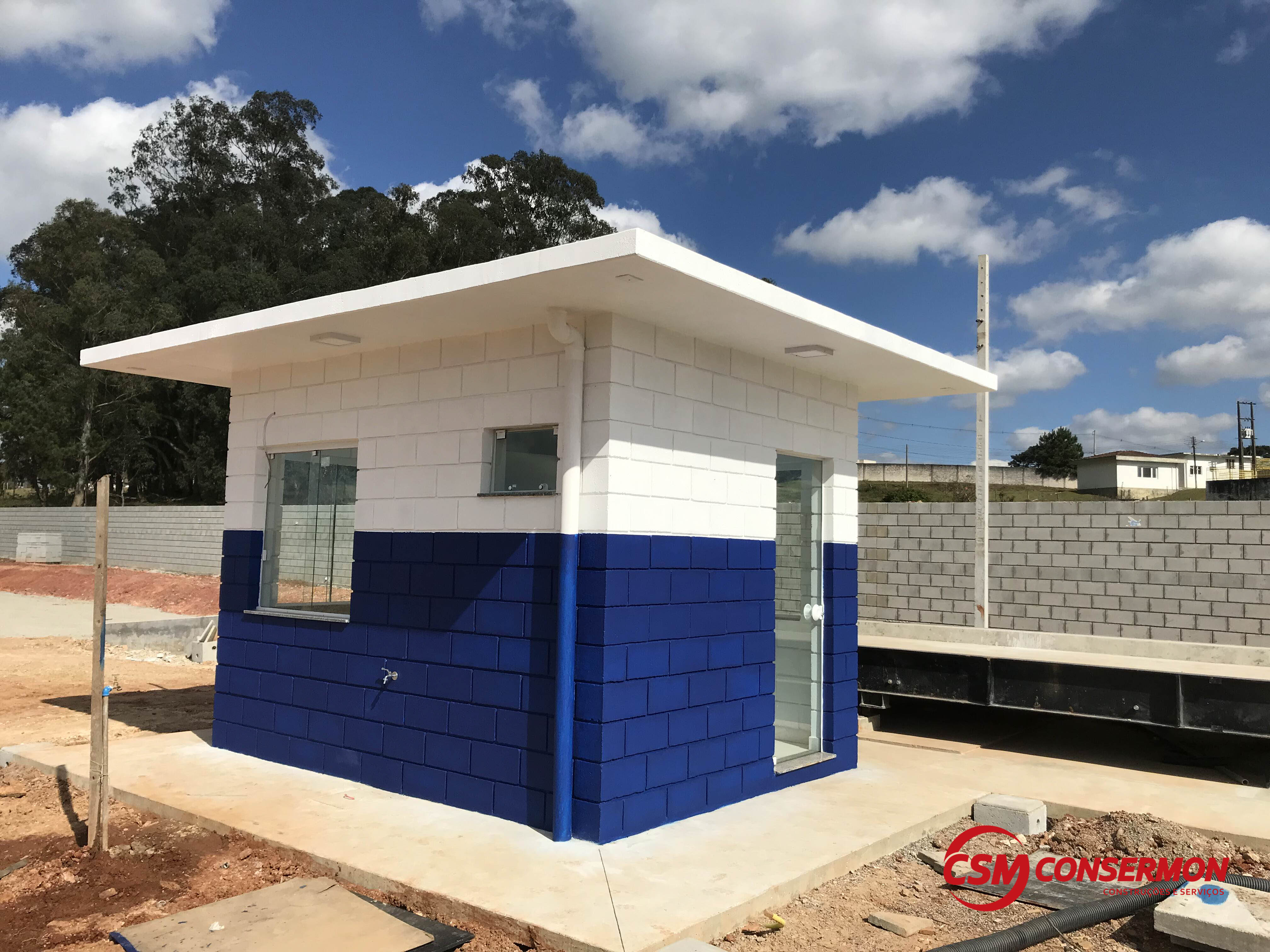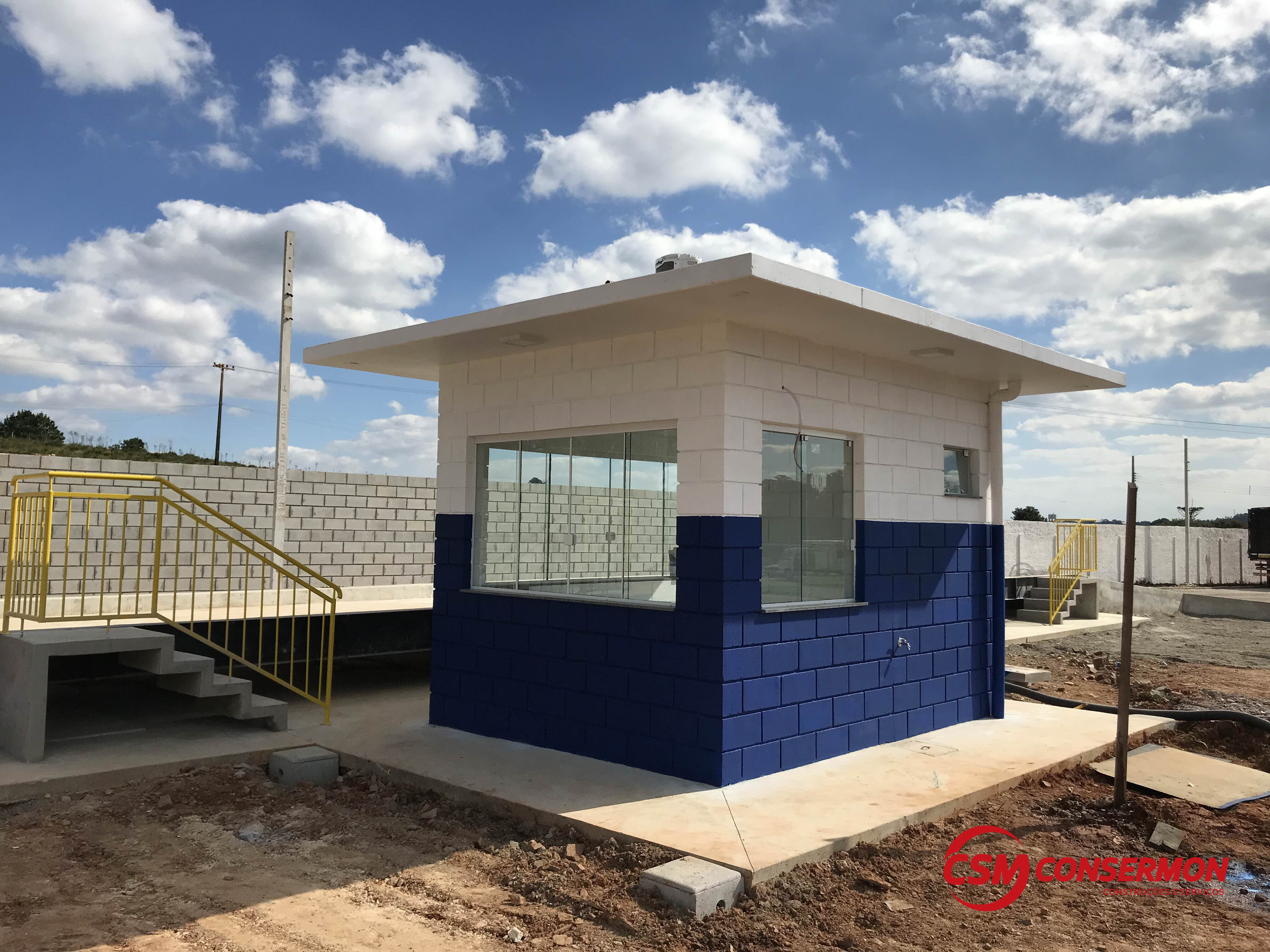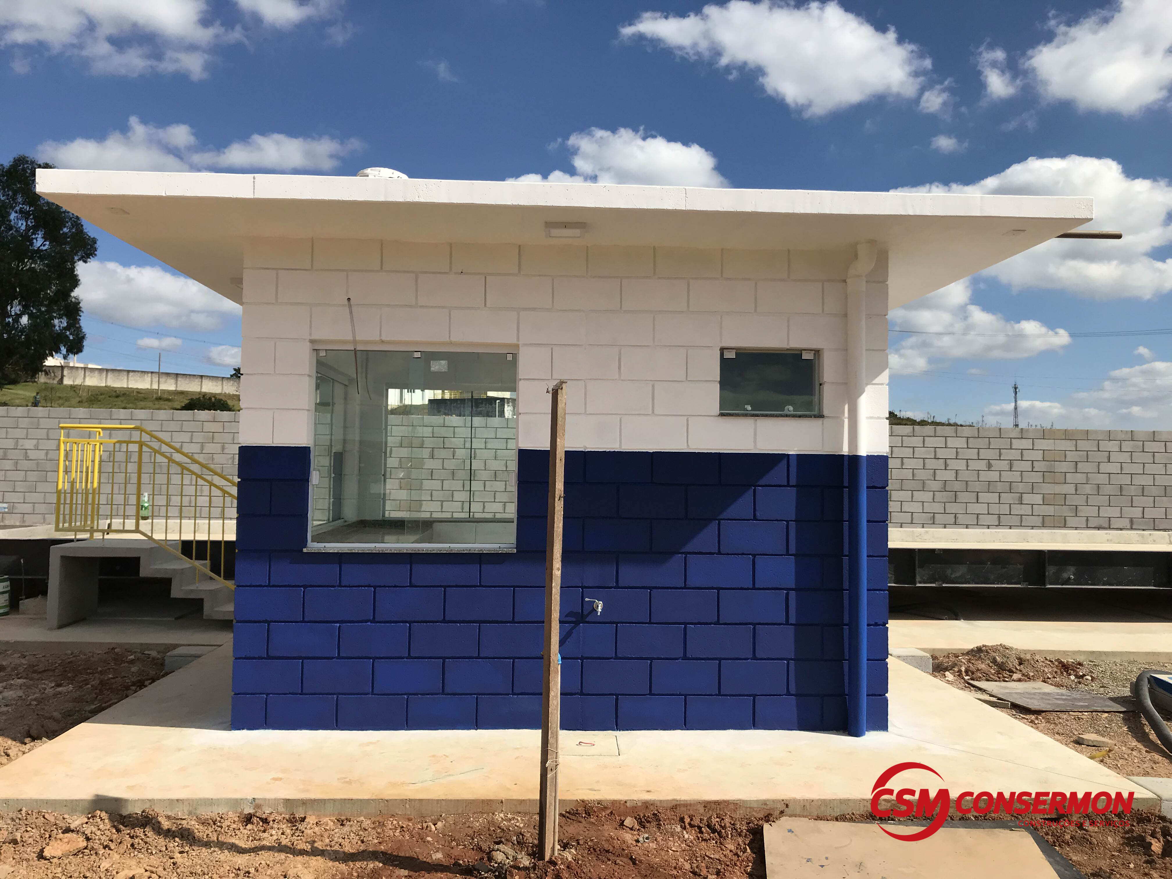 Obra: Edificação de controle com banheiro, construída com blocos de concreto aparentes, estrutura embutida e acabamento frisado.