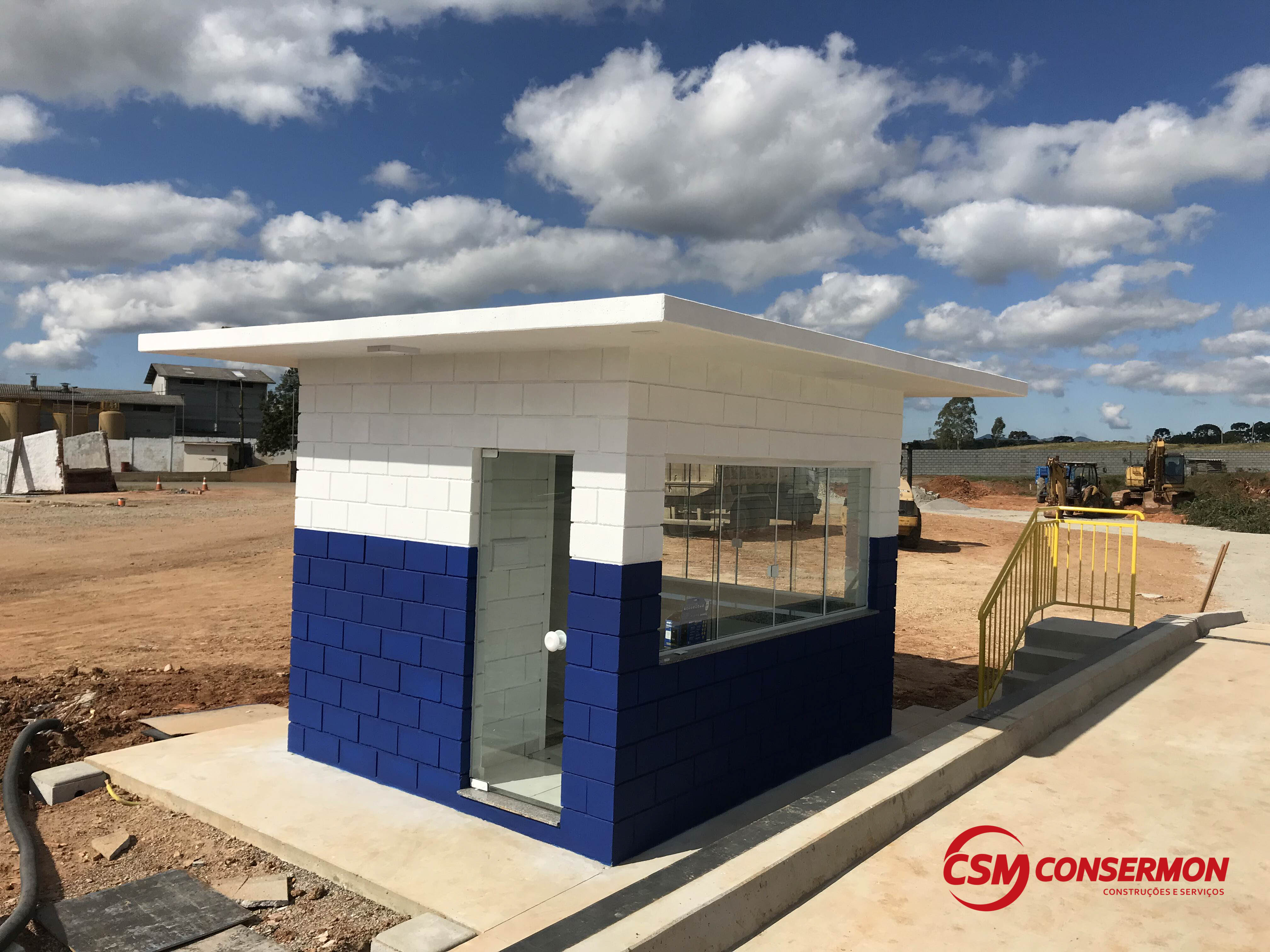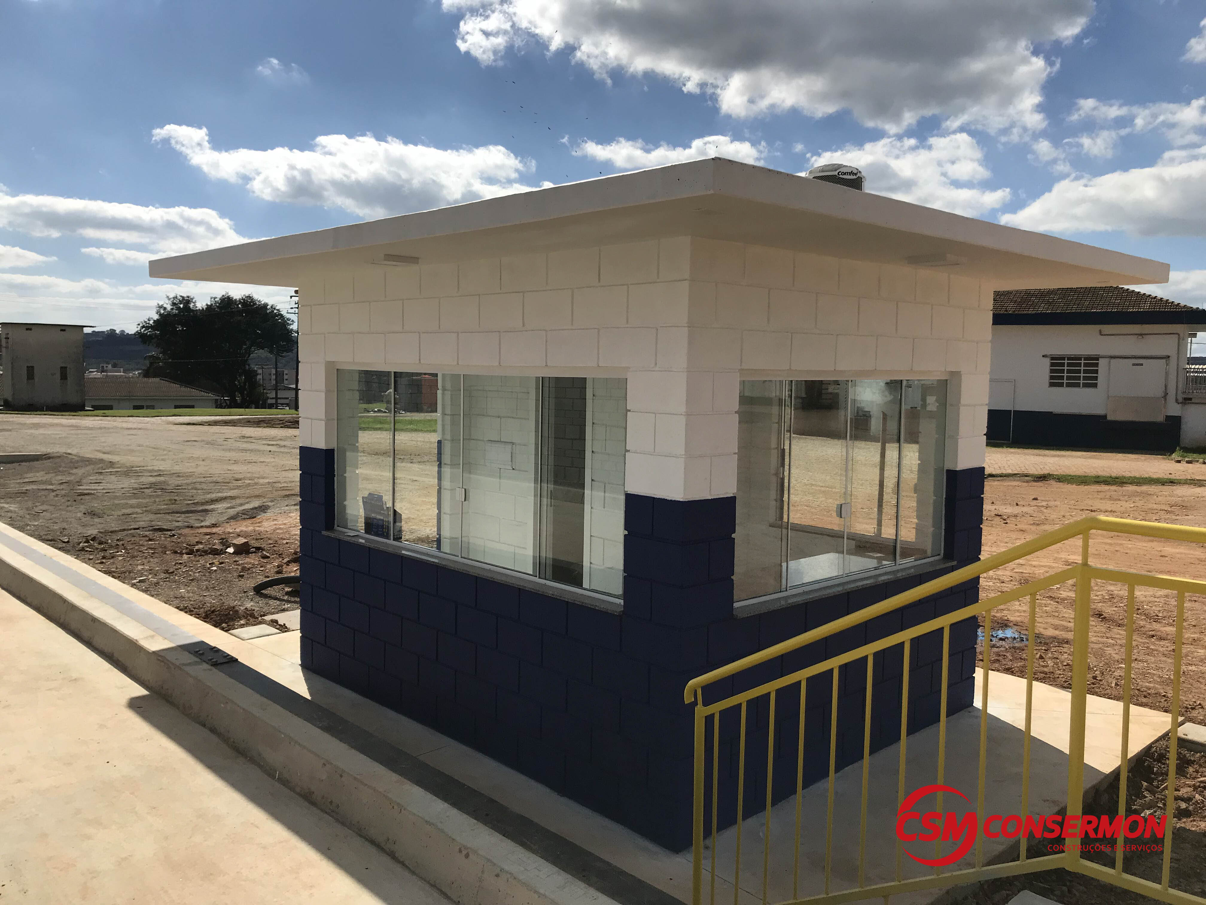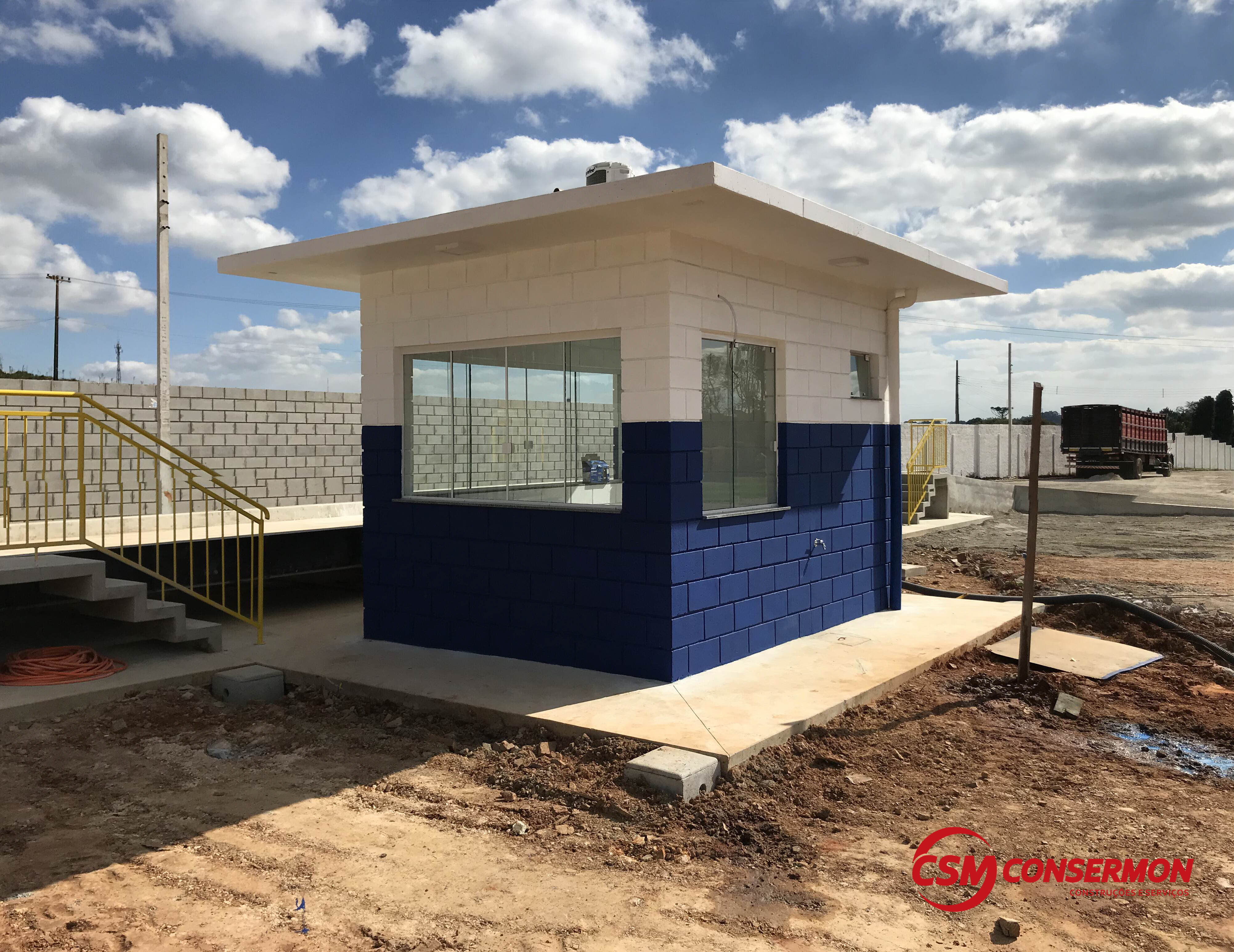 Obra: Edificação de controle com banheiro, construída com blocos de concreto aparentes, estrutura embutida e acabamento frisado.